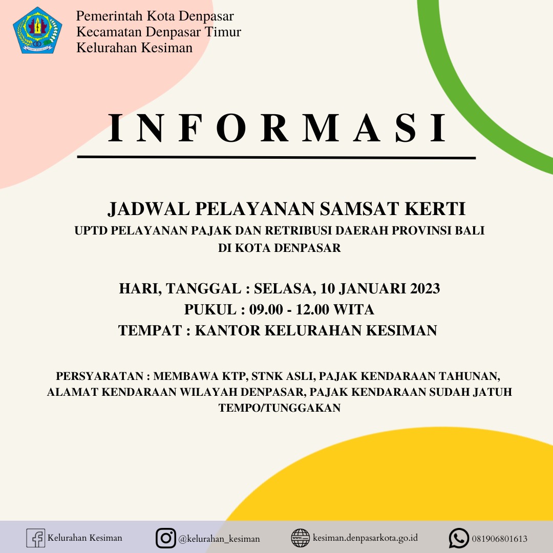 Informasi Pelayanan Samsat Kerti di Kelurahan Kesiman, Selasa 10 Januari 2023.